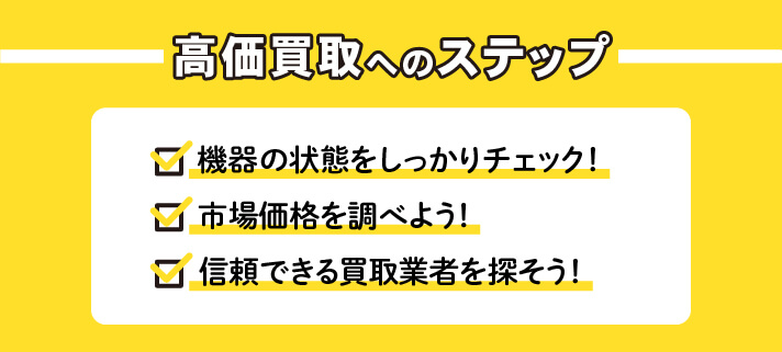 高価買取を実現するには、機器の状態を良好に保つこと、市場価格を把握すること、信頼できる業者を選ぶことが重要です。