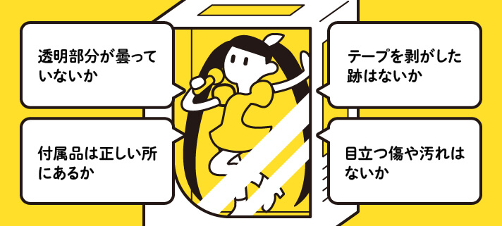 ・シールやテープが剥がされた跡がないか:粘着部分が浮いていたり、再接着の跡があると、開封済みの可能性が高いです。