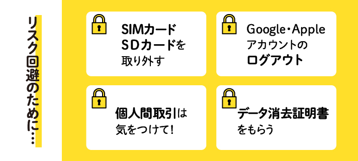 どうしても個人間取引を行う場合は、事前にデータ消去を徹底し、できるだけ対面で取引を行うことが重要です。