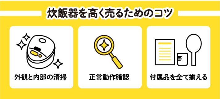 不用になった炊飯器を高く売るためには、メーカー、機能、製造年式、容量といった要素に加え、外観・内部の清掃、機能の正常動作確認、付属品完備が重要です。