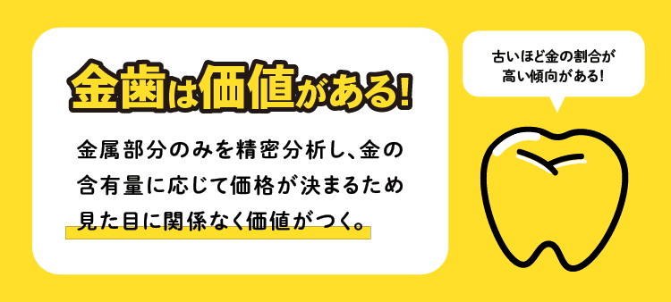 金歯は見た目や状態にかかわらず、金が一定量含まれていれば立派な貴金属資産として買取が可能です。