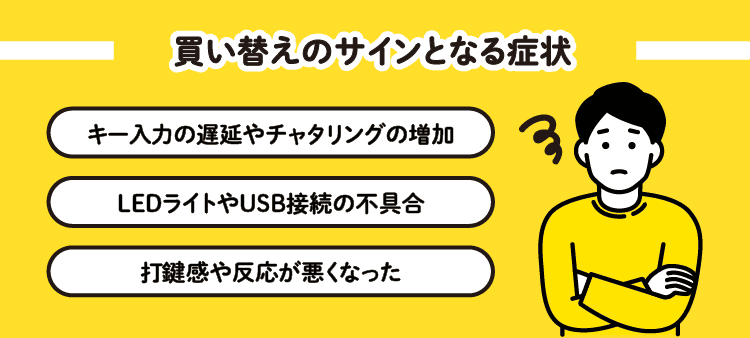 キーの反応不良や打鍵感の変化、ライトや接続の不具合が出てきたら、買い替えを検討するタイミングといえるでしょう。